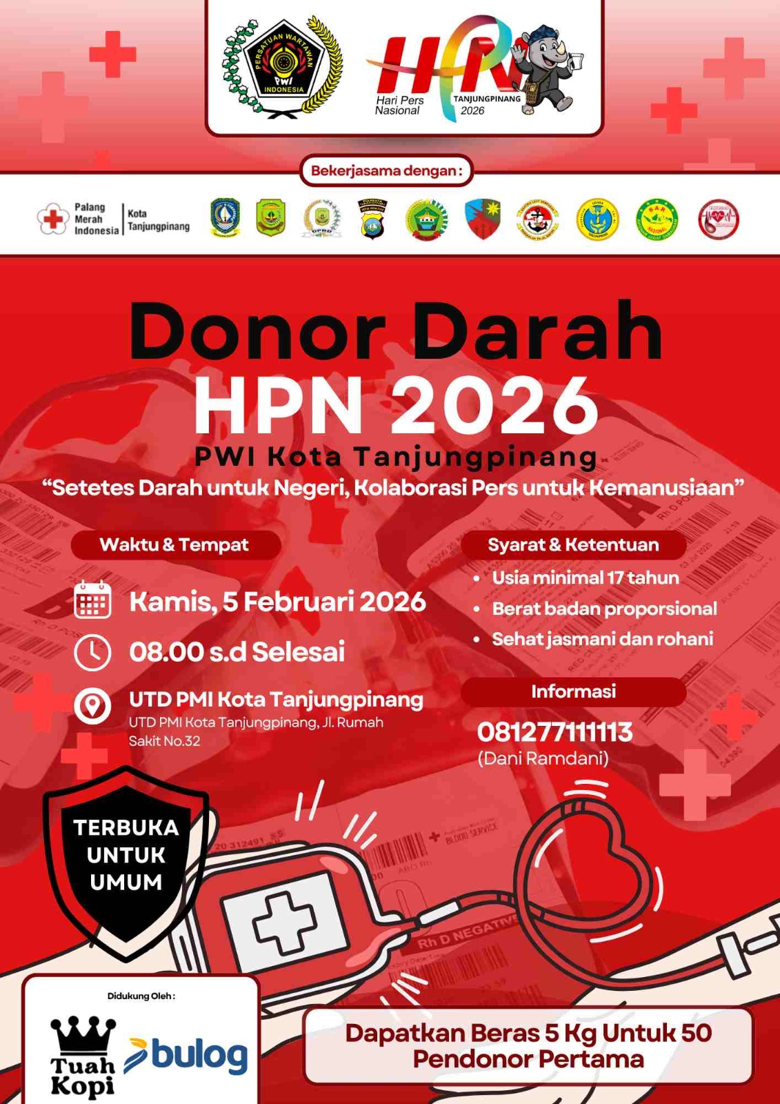 Wawako Raja Ariza juga menyampaikan terima kasih kepada PWI Tanjungpinang atas inisiatif penyelenggaraan kegiatan donor darah dalam rangka HPN 2026.