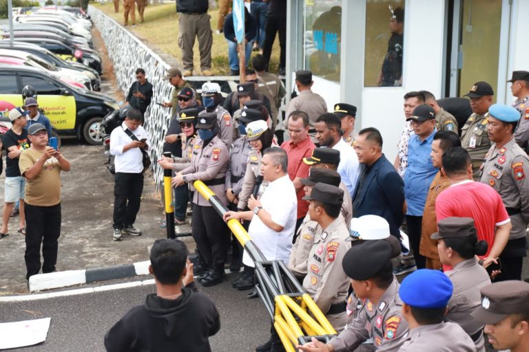Ketua Komisi III DPRD Provinsi Kepulauan Riau, H. Teddy Jun Askara, S.E., MM, saat menerima langsung aksi unjuk rasa para Driver Maxim di halaman Gedung Sekretariat DPRD Provinsi Kepulauan Riau, Pulau Dompak, Senin (09/02/2026).